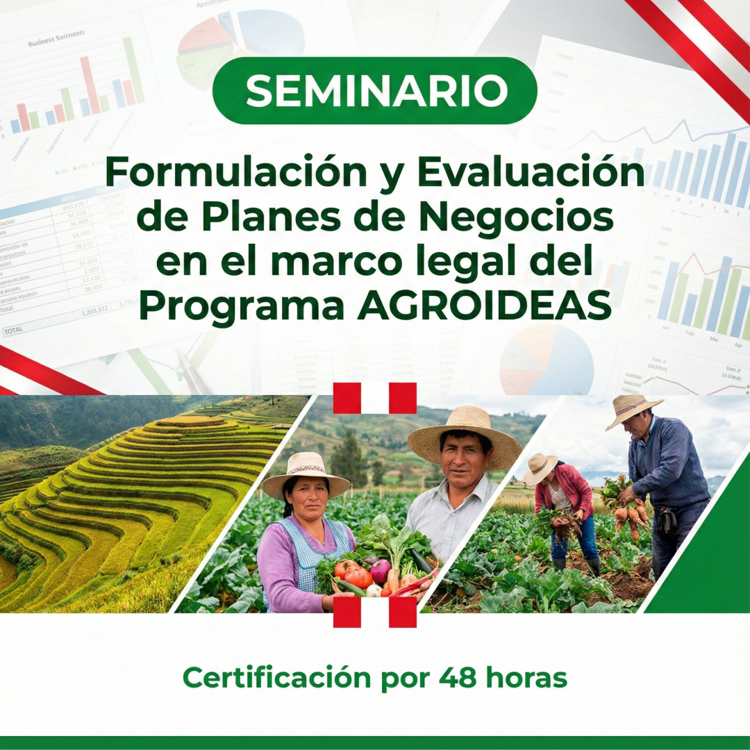 El Programa de Compensaciones para la Competitividad (Agroideas) se ha consolidado como el motor principal para el desarrollo de la agricultura familiar en el Perú. Entender la formulación y evaluación de planes de negocios Agroideas no es solo una capacidad técnica, sino una ventaja estratégica para profesionales que buscan gestionar incentivos no reembolsables destinados a la adopción de tecnología, asociatividad y gestión empresarial. Este seminario aborda los criterios de elegibilidad y la estructura de los Planes de Negocio (PN) bajo el marco legal vigente, garantizando que los proyectos cumplan con los estándares exigidos por el Ministerio de Desarrollo Agrario y Riego (MIDAGRI).